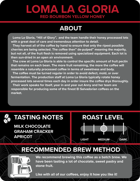 The crew at Loma La Gloria is able to control the specific amount of fruit pectin that remains on each bean. The more fruit remaining, the more the coffee will resemble a naturally processed coffee in terms of sweetness and body.